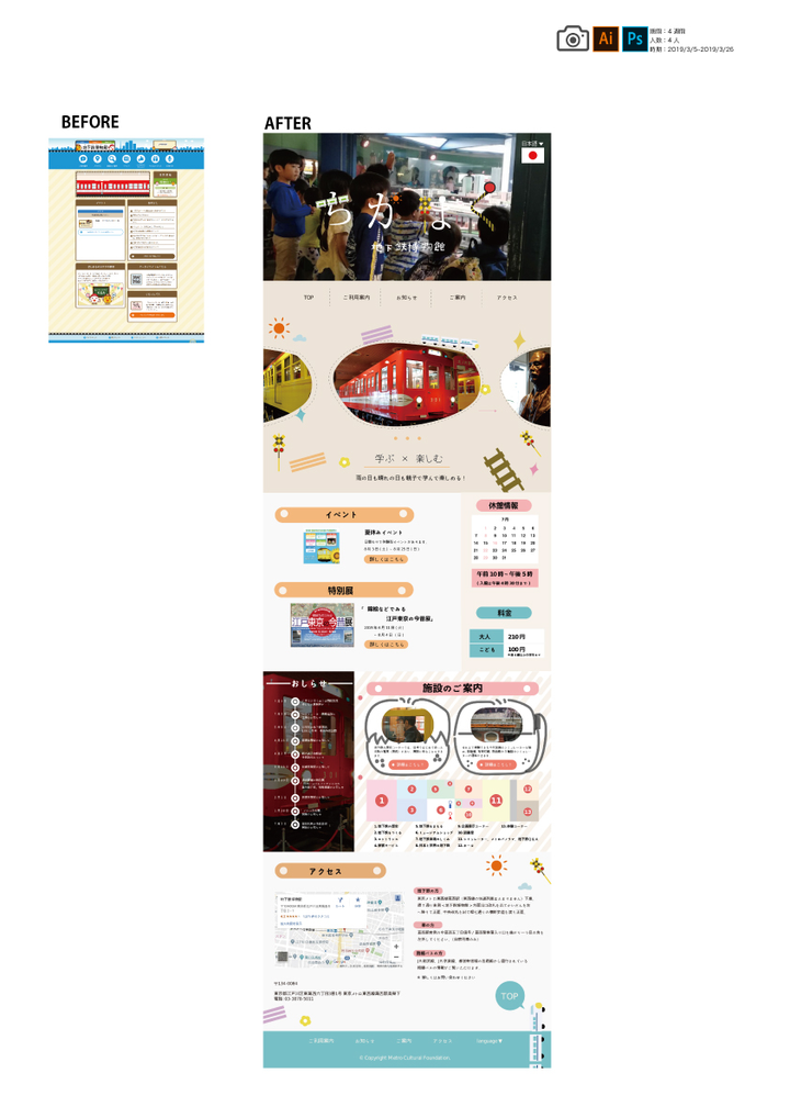 地下鉄博物館のWEBページをチームで作成。 訴求点としては4人いるチームをスムーズにファシリテーションしたことである。 WEBページ作成にあたって各人の強みを引き出した。より生産性を高めるため制作MTG前に事前に類似の児童向けWEBサイトを下調べして何案かMTGに持っていきWEBサイトの方向性を決めるとともに各セクションの責任者を割り振った。