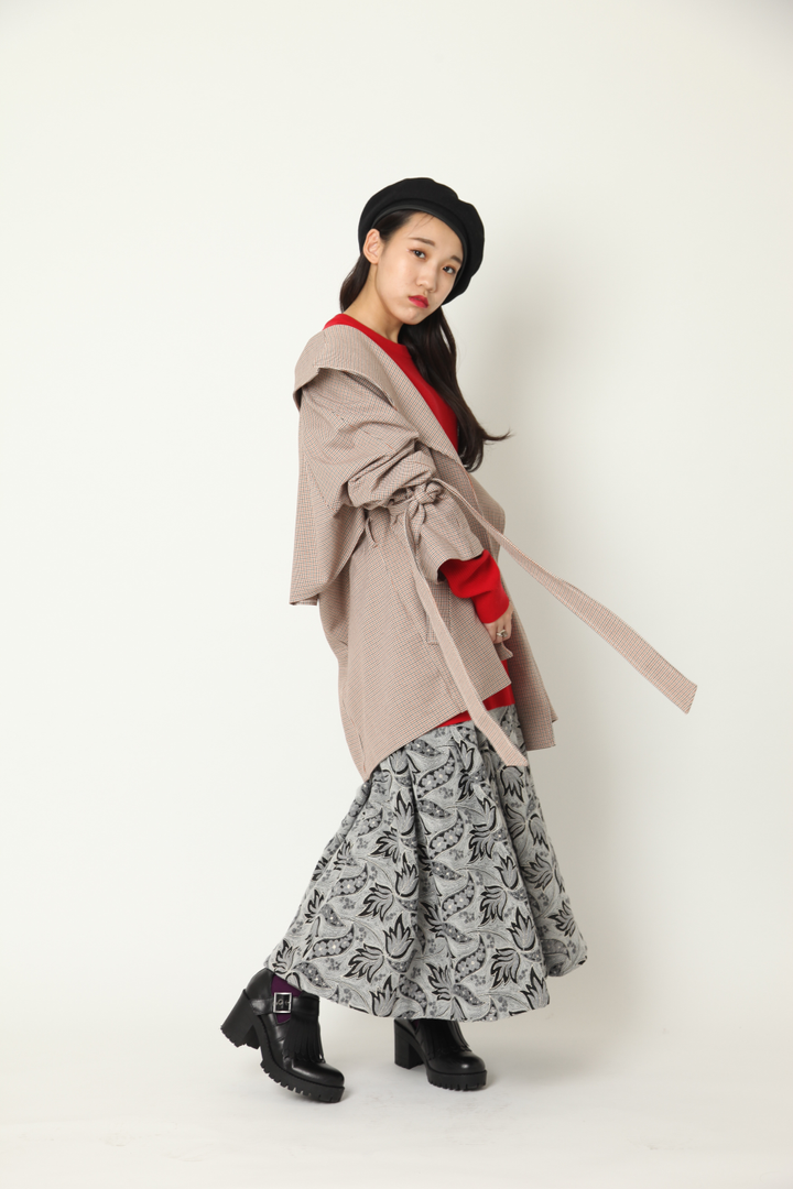 実際にあるブランドから服を借りてスタイリング - コートの紐を腰回りに付けず、腕に巻くことによりワンポイントを作り出す - 他の色を落ち着いた色に、トップスを赤色にすることで際立たせることができる