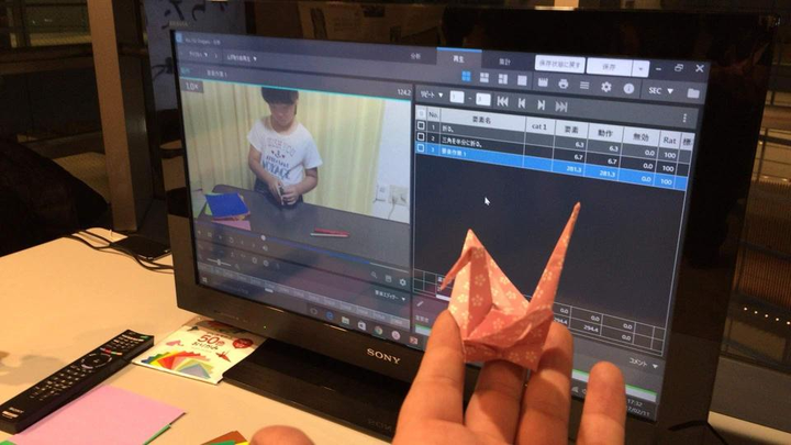 これ、発表の前日。子供に折り紙を折ってもらう、計測、複数回、計測 すると苦手な箇所がわかる。 同時にセンシングで動作情報を解析、すると苦手の原因がわかる 苦手の解決をサポートする内容にフォーカスした指導書が作れるって感じです。