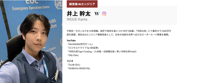株式会社TIESBRICK社所属のタレントとして、元不登校の学生起業家として不登校などの社会課題を解決するため奔走をしている。 https://tiesbrick.co.jp/profiles/inoue/