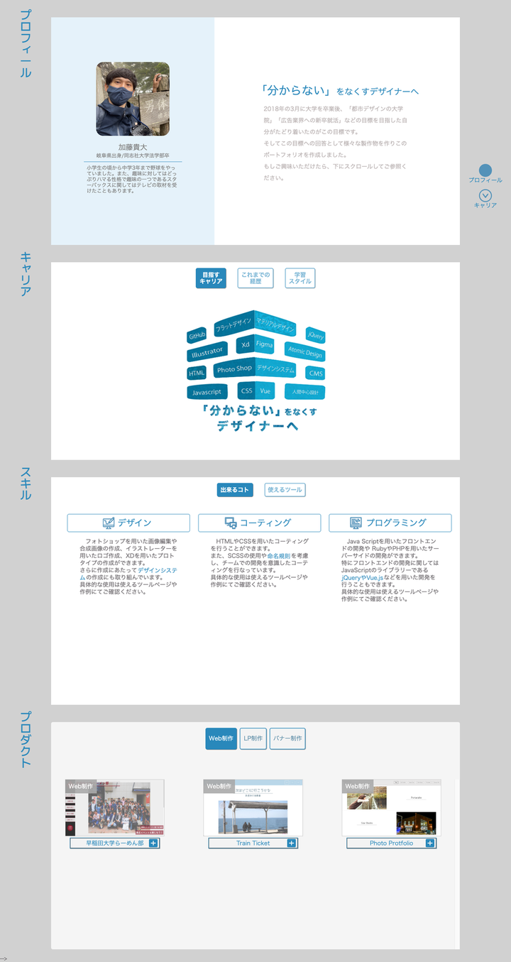 ウェブ制作、LP、バナーなどの制作物や自身の思いやスキルを表現するためにポートフォリオを作成しました。 開発はAdobe XDでプロトタイプを作り、以下の開発環境でコーティング及びプログラミングを行いました。 開発環境 ・Adobe XD ・vs code ・firebase 開発言語 ・HTML ・CSS ( SCSS ) ・ Java Script ( Vue.Js, jQuery )