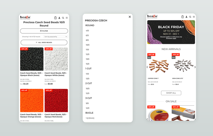 - カナダのビーズショップのEコマースサイトにおいて、コア商品カテゴリーページとモバイルナビゲーションを強化し、検索ランキングの向上とクロスセルによって売上を1.5倍に増加させました。