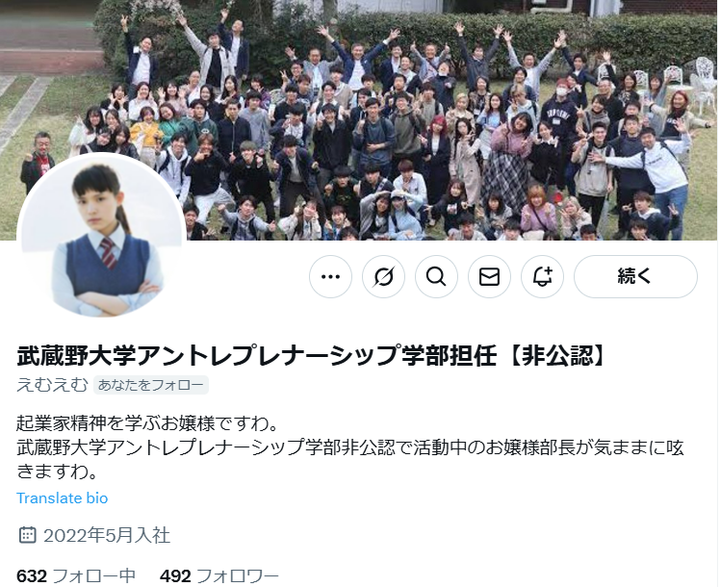 オープンキャンパスに高校生を集めてくるという課題が出た際に開設したアカウントです。 当時お嬢様部と題しお嬢様言葉でSNSのやり取りを行うという流行りがありました。 起業に関する事、授業内容や生徒のプロジェクトに関する告知などを行うアカウントへと変化していきました。 497フォロワーいます。