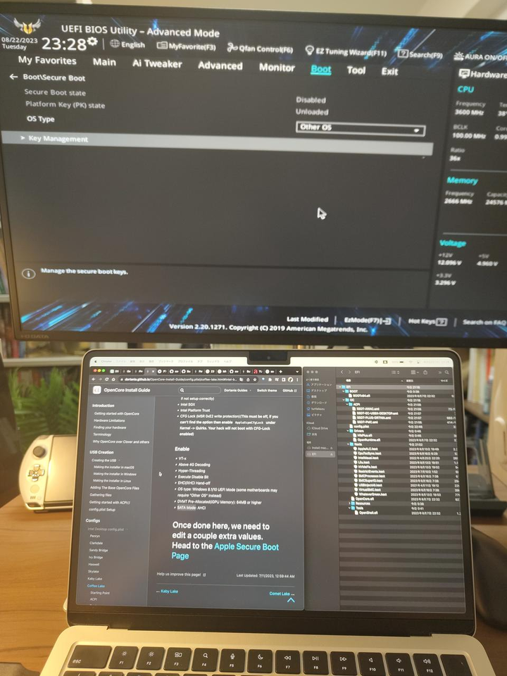大きな声では言えませんが、Hackintoshに挑戦してみました。 自作PC(intel core9 9900k、マザーボードz390)に、MacOS Venturaをインストール。 EFIの準備がほぼ8割、BIOSの設定が1割、OpenCoreをUSBからSSDに移動させるのが1割、という印象でした。 Xcodeも無事に起動し、Compose Multiplatformを24GBのRAMでビルドできるようになりました。