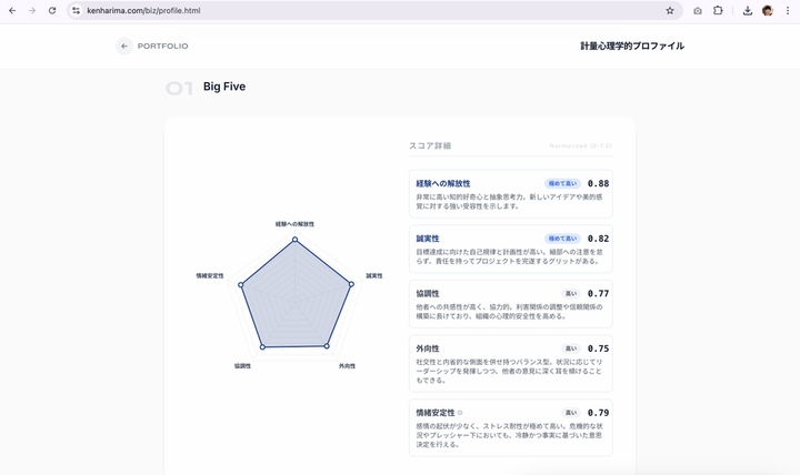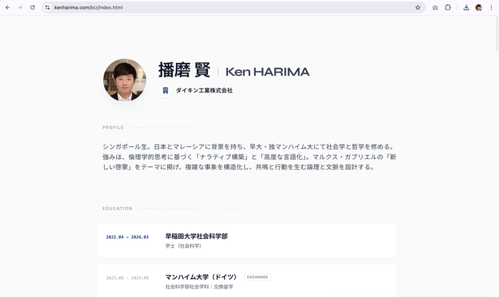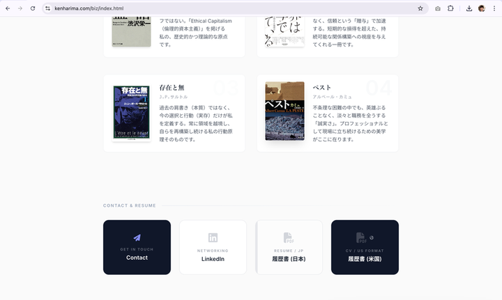 自身の公式ポートフォリオサイトを制作しました。 以下の機能がご利用いただけます。 - プロフィール及び現在の勤務先 - 学歴 - コンピテンシー5つ - 計量心理学的プロファイル(BIG5分析・PVQ分析) - 厳選された活動・受賞歴のコラム紹介 - 得意分野3つ - 私の哲学のルーツとなった厳選書籍4冊 - 連絡専用フォーム - 履歴書のダウンロード(日本形式・米国形式) Wantedlyだけでは知り得ない私に関する情報を、独自のミニマリズムに基づくUIで、タイムリーにお届けします。サイトは日英に対応しており、ユーザーの使用デバイスの設定言語に準拠して自動的にその言語で表示します。(日英以外の言語を使用している場合は、自動的に英語表示となります。)加えて、最近取得したGoogle アナリティクス認定資格(GA4)の知識を総動員し、個人のプライバシーを守る倫理性の高いサイトを構築しました。 Announcing the launch of my official portfolio website. I have designed this site to offer a timely and comprehensive view of my professional identity—going far beyond standard profiles like Wantedly—presented through a custom UI grounded in my philosophy of minimalism. Key Features: Profile & Current Affiliation: My background and role. Education: Academic history. 5 Key Competencies: My core professional strengths. Psychometric Profile: Personality insights via Big 5 and PVQ analysis. Projects & Awards: In-depth columns featuring selected achievements. 3 Areas of Expertise: My primary focus areas. Intellectual Roots: 4 seminal books that shaped my philosophy. Contact & Resume: Dedicated contact form and resume download (available in Japanese & US formats). Technology & Ethics: The site supports seamless auto-localization (English/Japanese) based on your device. Furthermore, applying my Google Analytics (GA4) certification, I have engineered the site with a strict ethical framework to ensure the highest standard of user privacy.