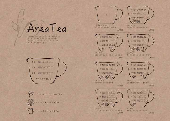 池袋にあるナチュラルな焼き菓子と紅茶のカフェ『plateaux』の 企画からイラストまで全て担当いたしました。 以前は紅茶の名称の表記のみで、 味を聞きづらいお客様もいるということで 見るだけでわかるようなデザインに改良しました。 香り、渋み、コク、のタイプでの選び方。 ストレート、レモン、ミルク、の飲み方での選び方。