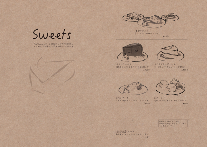 池袋にあるナチュラルな焼き菓子と紅茶のカフェ『plateaux』の 企画からイラストまで全て担当いたしました。 以前のスイーツのメニューが文字のみで、 よくお客様から料理内容を聞かれたため、 手書き感溢れるイラストをいれ、わかりやすくしました。
