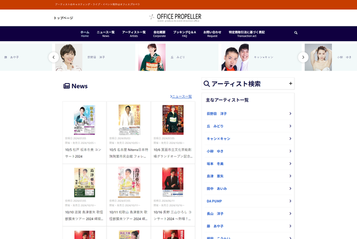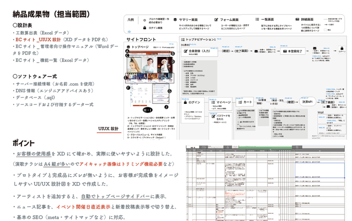 <<担当範囲(UIUXデザイナー)>> ●工数算出 ●設計(納品物後述) ●お客様とのやりとり・進行・公開 ●デザイン(納品物後述) ●コーディング(wordpress オリジナルテーマ) <<チーム体制>> 全2名体制(適宜エンジニアの社内アドバイスあり) ●進行・UI/UXデザイナー 1名(本間) ●マーケッター・テスター 1名 <<ポイント>> ・お客様の使用感をXDにて確かめ、実際に使いやすいように設計した。 (演歌チラシはA4縦が多いのでアイキャッチ画像はトリミング機能必要など) ・プロトタイプと完成品にズレが無いように、お客様が完成像をイメージしやすいUI/UX設計図をXDで作成した。 ・アーティストを追加すると、自動でトップページサイドバーに表示。 ・ニュース記事を、イベント開催日直近表示と新着投稿表示等で切り替え。 ・基本のSEO(meta・サイトマップなど)に対応。
