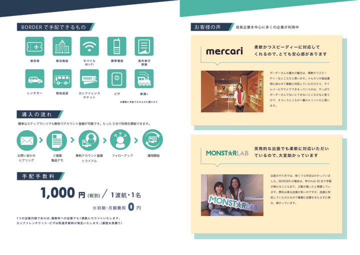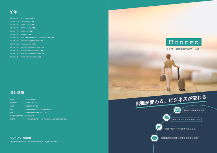 クラウド海外出張手配サービス『BORDER』さんから依頼を受けた会社案内(リニューアル)のデザインを紹介します。 内容:会社案内リーフレットリニューアル部分デザイン 依頼主:上記に同じ ディレクター:西田篤史