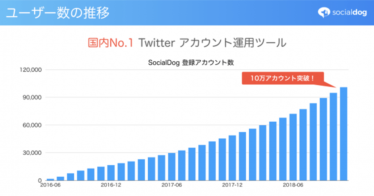 SocialDog のユーザー数が10万アカウントを突破し、国内 No.1 Twitter 管理サービスに