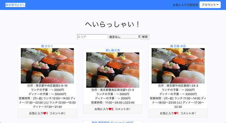 ソースコード(GitHub) https://github.com/light130/SushiSagashi 東京の寿司屋を検索し、感想の共有やお気に入り登録ができる口コミサイト テストユーザー ・メールアドレス : test@example.com ・パスワード : password