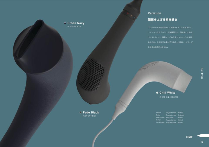 ひとり暮らしに向けのドライヤーの提案。 形状デザインはもちろんのこと、ターゲットユーザからCMFを想定し、 説得力のあるビジュアルを実現しました。