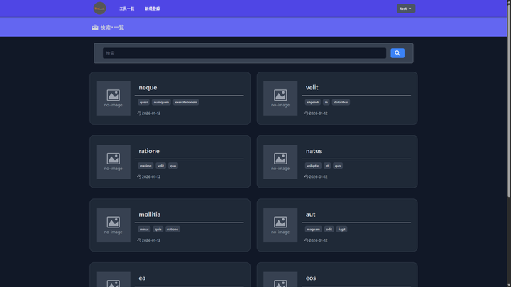 製造業・建設現場で使用される工具の 正式名称・通称・略称を一元管理し、検索できるWebアプリケーションです。 工具が別名で呼ばれることによる認識齟齬を防ぎ、 画像と検索機能によって直感的に工具を特定できることを目的としています。 新人や異動者、非作業者でも迅速に工具を特定できるようにし、作業効率と安全性を向上させる。 ※ ゲストユーザーでも一覧・検索・詳細閲覧が可能