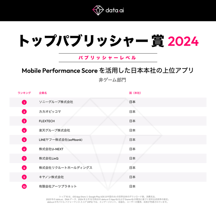 data.ai:日本のアプリ(非ゲーム)配信企業10位
