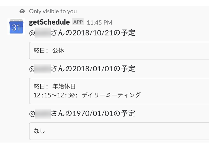 Slackで任意のユーザのGoogleカレンダーの予定を確認するスラッシュコマンド。 https://qiita.com/kurapy-n/items/5ea9860dea5fdc3a978a