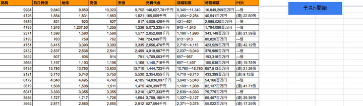 ボタン一つで欲しい株銘柄の情報をスプレットシートに書き込みます。