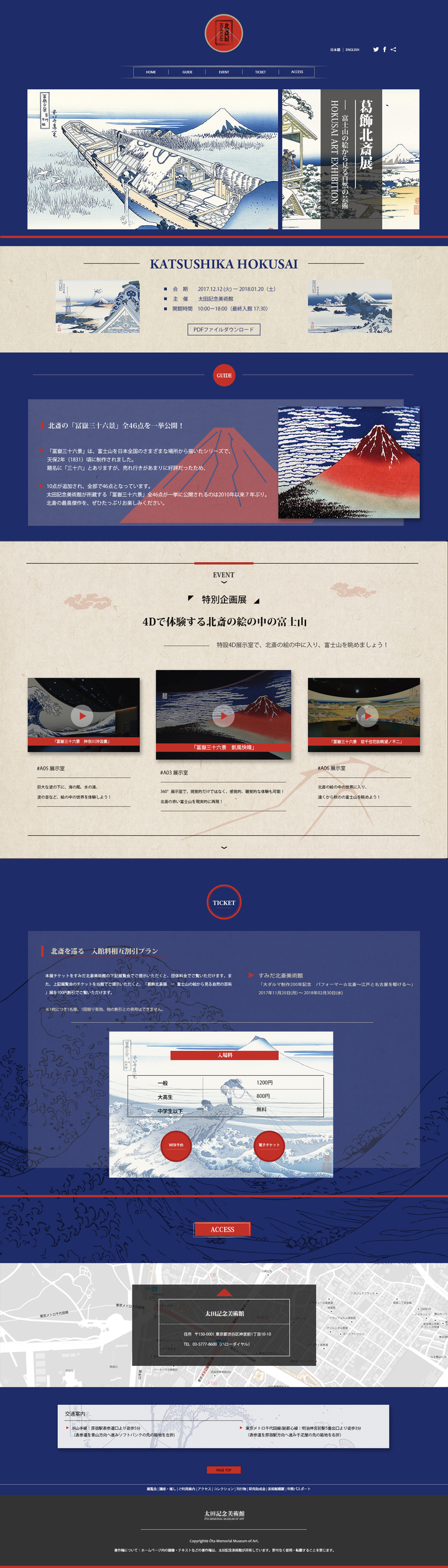 葛飾北斎作品の展示会を提案し、WEBサイトをデザインする課題です。 北斎の名作「富嶽三十六景」を立体的に展示する展示会を提案して、動画によって現場を体験してもらうサイトを提案しました。北斎の絵は美術の価値だけではなく、異なる位置、角度から眺める四季の富士山の風景から、自然の美が感じられます。最新の技術を生かした4D展示室の設置により、来客が北斎の絵の中に入り、「展示される」美術 を「体験できる」美術に変えます。自然の芸術を体験することにより、普段「絵画や美術品に興味がない」人々も美術館に来てもらい、北斎の作品をはじめ、浮世絵、美術に関する興味を持ってきてもらうことが望まれます。