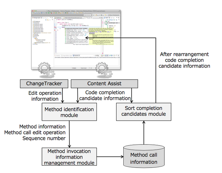 It is my undergraduate research project about programming support. I developed a tool for Eclipse that can do code completion for the user. By analyzing the edit history of the developers, the tool calculates the interest degree for the candidates that may be used.