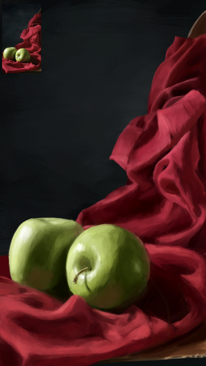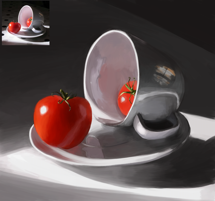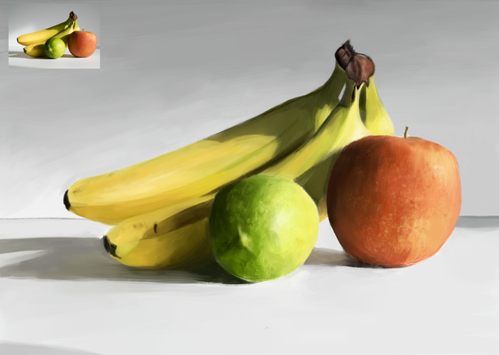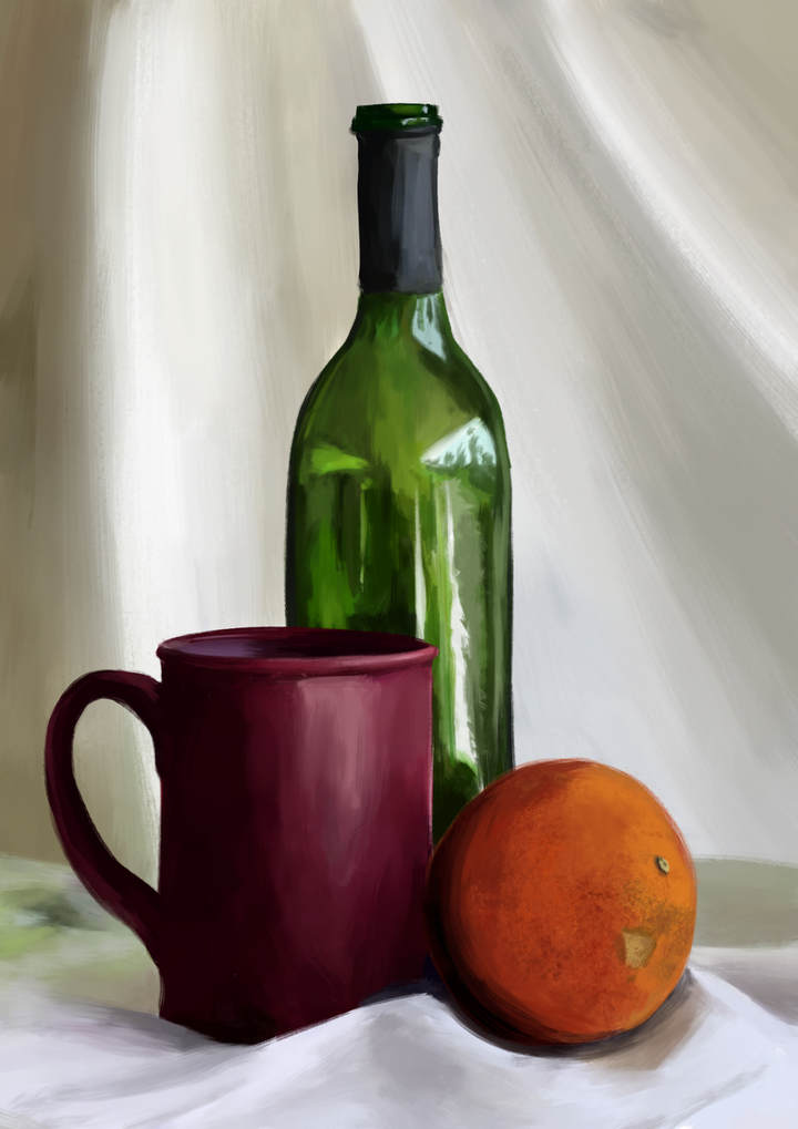 光や影、配色バランスの理解を深めることを目的に、「アイビスペイント」で描いた静物画です。
