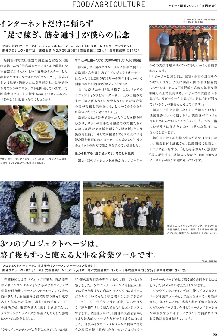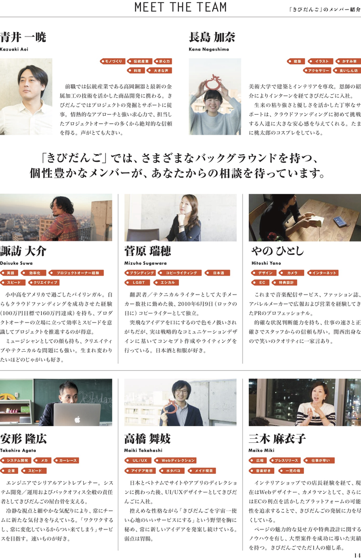 (type of work: 企画、ディレクション、コピーライティング、ライティング、インタ ビュー) <制作意図/解説> クラウドファンディングサイトを運営するクライアン トが2017年2月に創業4周年を迎えるにあたり、企業 パンフレットの刷新を行った。元々あった「海外のタ ブロイド紙」というコンセプトを全てのページに反映。 成功事例ページでは各プロジェクトが持つ「物語」に フォーカスし、読み物として楽しく読め、且つクラウ ドファンディング成功のコツが伝わるコンテンツを制 作。「新聞には広告が付き物」ということで、中央の 見開き2ページ含む4ページでは「広告風」のデザイ ンで、クライアントおよびプロジェクト開催者の企業 情報や今後の取組を紹介している。 ーーーーーーーーーーーーーーーーーーーーー クライアント名: きびだんご株式会社 制作時期: 2016年 媒体: 紙 チームメンバー: 青井 一暁(共同ディレクション) 羽田 順(アートディレクション)