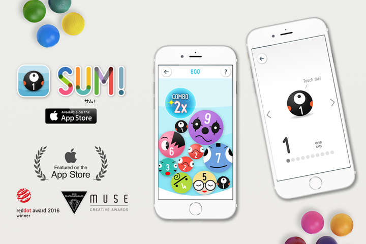 AppStore「子供向け」トップ特集 red dotコミュニケーション賞2016受賞 Muse Creative Awardsプラチナ賞受賞2016 Digitalえほんアワード受賞2017 https://appsto.re/jp/1LDjab.i 企画、コンセプト、UI,UX、アニメーション SUM!(サム)は足し算・引き算の概念を遊びながら理解できるアプリ。簡単なゲームとしても遊べます。ユニークな数字のキャラクターを動かして、合わせたり分けたりしながら、できるだけ早く10を作っていきます。子供にも一人一人個性があるように、数の性質をキャラクターの個性として表現。数字に親しみを持ち、足したり引いたりを楽しんでできる、子供だけではなくどなたにも楽しんでいただけるアプリです。数字をもっと好きになる、楽しい仕掛けもいっぱい! 子供向け4-6歳 ダウンロード数第1位(2016年6月)