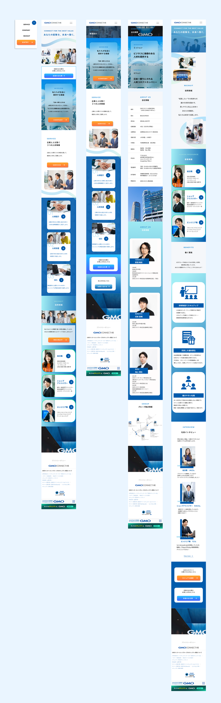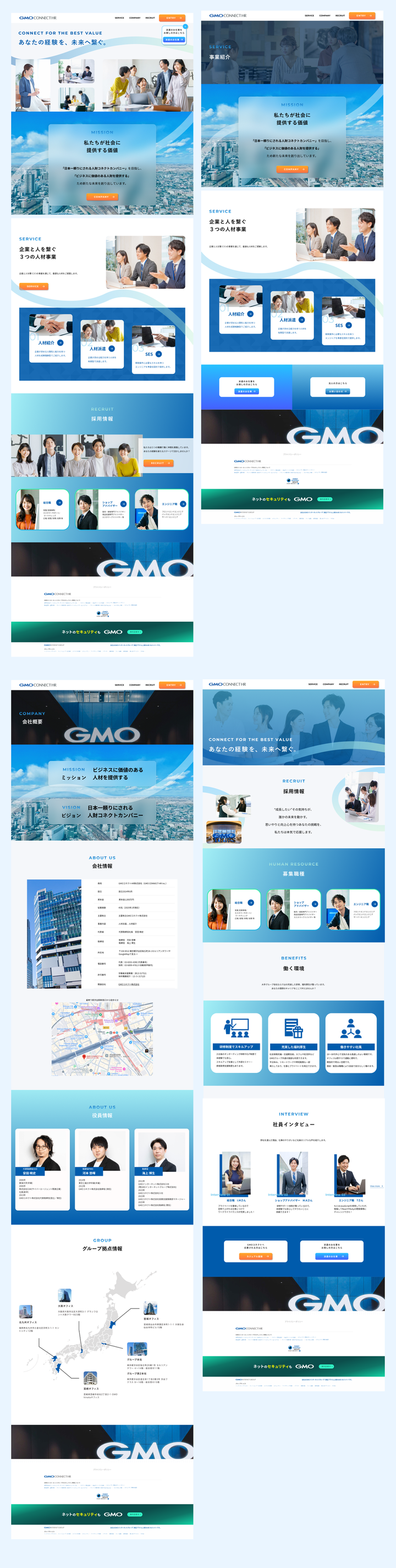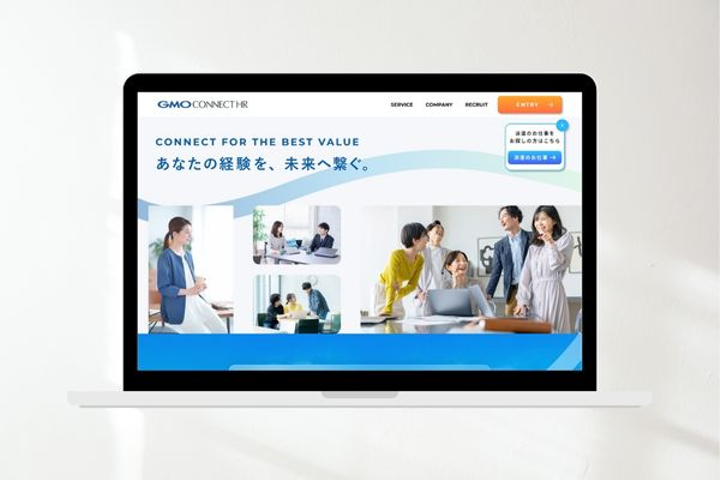 「信頼感 × 未来感 × ワクワク感」を軸に、GMOコネクトHRとしてのブランドらしさを大切にしながら、求職者にとって“共感”と“魅力”を生むデザインを目指しました。ファーストビューの曲線のあしらいで「あなたの経験を、未来へ繋ぐ。」をテーマに人と人とのつながりを表しています。 特に若手の求職者が「ここで働きたい」と感じられるよう、信頼感あるデザインに、動きや写真表現、グラデーションで未来への期待感、人とのつながりを大事にする企業カルチャーを伝えています。採用ページはもともとの依頼内容にはありませんでしたが、今回の目的が採用応募数の増加と質の向上ということだったので社員インタビューや大手ならではの福利厚生を紹介する内容の採用ページをご提案しました。