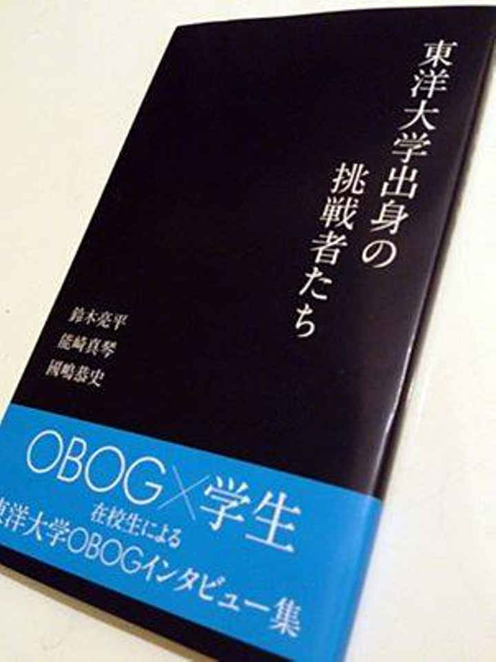 東洋大学出身の卒業生22名のインタビュー本 駅伝に代表されるスポーツ選手ではなく、一般受験を経て現在活躍している方で構成されています。 政界・声優・アナウンサー・会社代表・大学教員...etc 多様な業界の方々から生の声を頂き、一冊の本にまとめました。 *販売価格:¥648(税込み) 東洋大学内生協売店、HPにて販売中 大学生協HP http://goods.toyocoop.jp/products/detail.php?product_id=79