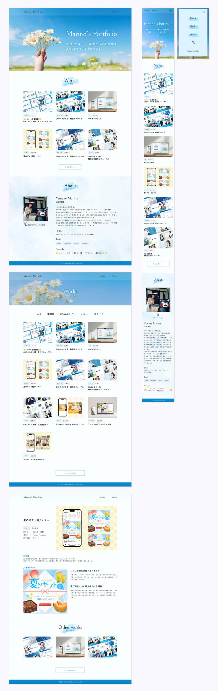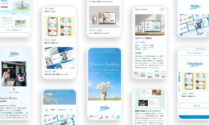 ■プロダクト概要 転職活動用に制作したポートフォリオサイトです。 ■工夫した点 ・採用担当者様が短時間で印象を掴めるよう「読み込まなくても分かりやすい」構成 ・各制作物詳細ページの構成(ビジュアルを多く見せ興味を持っていただける方はスクロールするとデザイン詳細説明が見えるようにした) ・SP版のスクロール負担を減らすトグル設置 ・レスポンシブ対応 ■言語・ツール Figma Photoshop