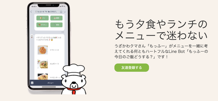 うざかわクマさん「もっふー」が夕食やランチのメニューを一緒に考えてくれる何ともハートフルなLine Bot「もっふーの今日のご飯どうする?」です!