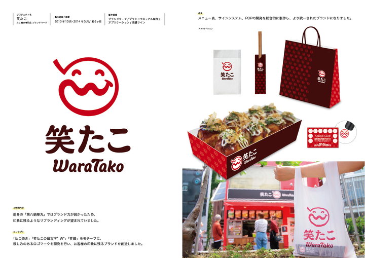 『コンセプト』 「たこ焼き」「笑たこの頭文字”W”」「笑顔」をモチーフに、 親しみのあるロゴマークを開発を行い、お客様の印象に残るブランドを創造しました。 『製作領域』 ブランドマーク、ブランドマニュアル製作、アプリケーション展開、店舗サイン