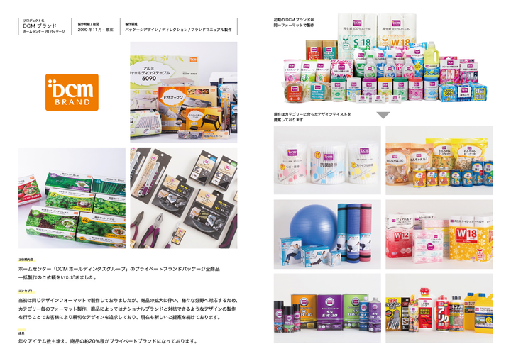 ホームセンター「DCMホールディングスグループ」のプライベートブランドパッケージ全商品一括製作のご依頼をいただき、現在も担当させていただいております。 当初は同じデザインフォーマットで製作しておりましたが、商品の拡大に伴い、様々な分野へ対応するため、 カテゴリー毎のフォーマット製作、商品によってはナショナルブランドと対抗できるようなデザインの製作 を行うことでお客様により親切なデザインを追求しており、現在も新しいご提案を続けております。 『製作領域』 パッケージデザイン製作・進行管理・デザイン管理(デザイナー3~6人)・クライアント打ち合わせ・ブランドマニュアル製作