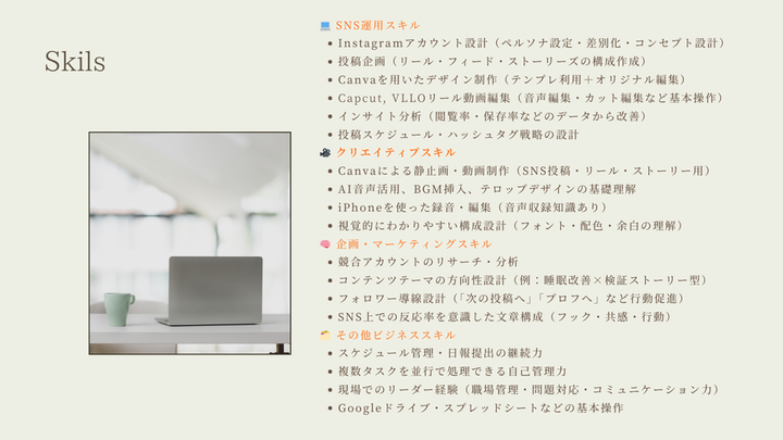 今後は、単なる投稿制作にとどまらず、 「成果に直結するSNS運用パートナー」として、より深くクライアント様の事業に関わっていきたいと考えています。