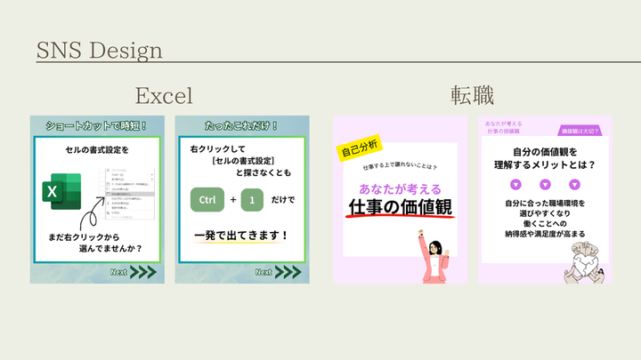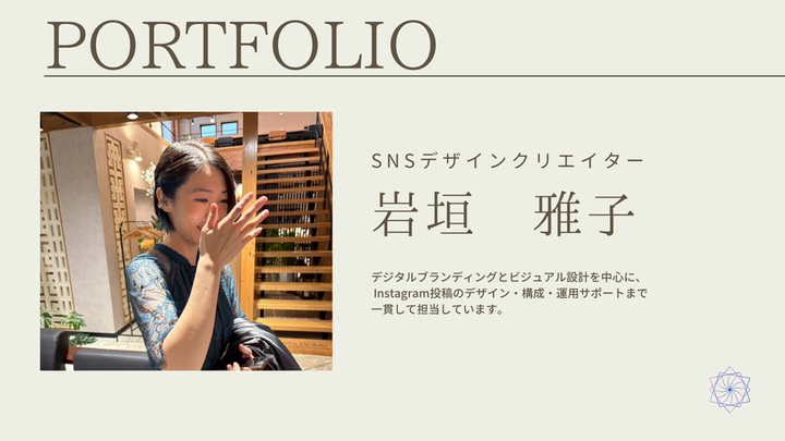 現在、SNS運用とデザインを中心に、Instagramアカウントの設計・投稿制作・分析改善などを行っています。