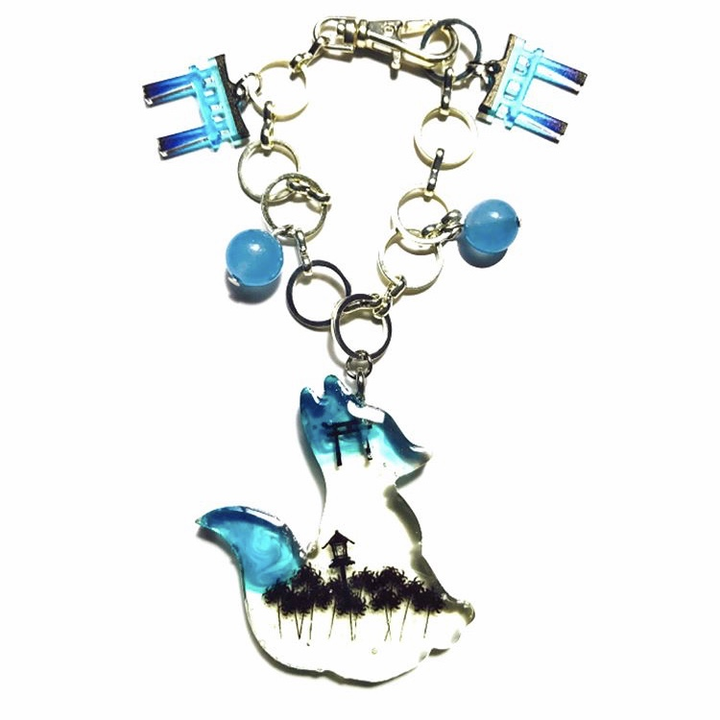 レジンで制作した狐のパーツを使用した和風のバッグチャームです。