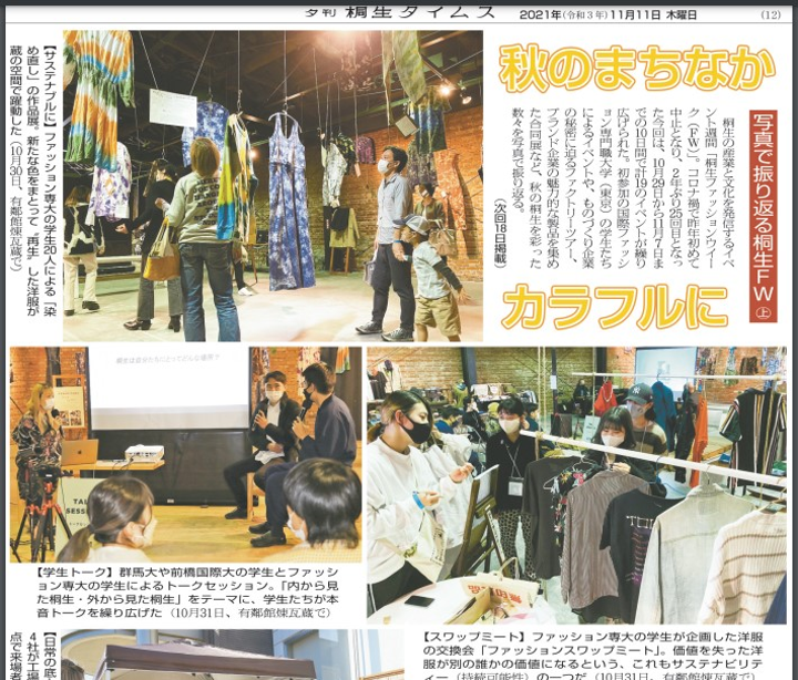 2021/10/30~2021/11/3 日本を代表する繊維の複合産地である群馬県桐生市で行われた「桐生テキスタイルマンス」に出展。古着を染め直すことで再生させ、その服への思い出をかいたカードと共に吊り下げて展示しました。また同時期に行ったファッションスワップミートでは、タグにメッセージを書い古着を現地の方の古着と交換し写真を撮影。私は当日現地へ赴くことができなかったのですが、友人が現地の方と交換できたよ!と私の古着と交換してくれたおばあさんのスナップを見せてくれました。このイベントの様子は、12月8日放送のテレビ東京・BSテレ東「都会を出て暮らそうよ BEYOND TOKYO」、10月29日、30日、11月11日に現地の新聞社桐生タイムスでも紹介されました。