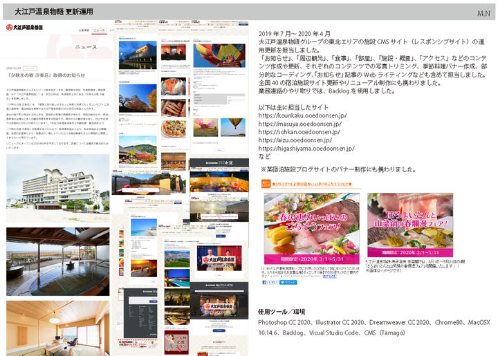2019 年7 月~ 2020 年4 月 大江戸温泉物語グループの東北エリアの施設CMS サイト(レスポンシブサイト)の運 用更新を担当しました。 「お知らせ」、「周辺観光」、「食事」、「部屋」、「施設・概要」、「アクセス」などのコンテンツ作成や更新、それぞれのコンテンツでの写真トリミング、季節料理バナー作成、部分的なコーディング、「お知らせ」記事のWeb ライティングなども含めて担当しました。 全国40 の宿泊施設サイト更新やリニューアル制作にも携わりました。 業務連絡のやり取りでは、Backlog を使用しました。 以下は主に担当したサイト https://kounkaku.ooedoonsen.jp/ https://masuya.ooedoonsen.jp/ https://sohkan.ooedoonsen.jp/ https://aizu.ooedoonsen.jp/ https://higashiyama.ooedoonsen.jp/ など ※某宿泊施設ブログサイトのバナー制作にも携わりました。