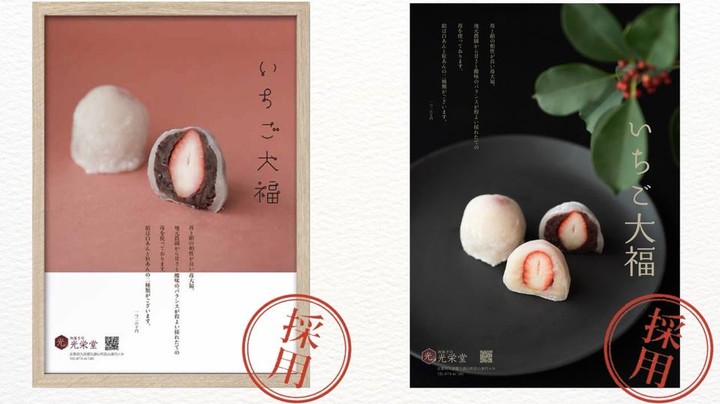 いちご大福のポスターデザインにおいて、年齢・性別だけでなく「好みの味」「普段触れているビジュアル」まで踏み込んだペルソナ設計を実施。 感情導線を意識したデザインにより、複数案が採用されました。 また、ロゴ制作では最終選考まで選出。 クライアントより「日頃、従業員間で話しているお店の名前に込めた想いが形になっていて、驚いた。」と好評をいただきました。 Instagramの発信内容を徹底的にリサーチし、和菓子づくりに対する姿勢や大切にされている価値観を読み取り、丁寧さを軸にデザインしたことが評価につながりました。