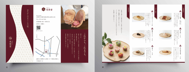 京都の老舗和菓子店様よりリーフレットのご依頼 ▪️目的 ・丁寧にこだわって作っていることを伝えるため ・ 役場や老人ホームなど施設に置いてもらうため ・ 販売イベント時に、このリーフレットを用いてご説明するため ▪️ターゲット ・風情を大切にする老若男女 ▪️意識した点 ・丁寧に和菓子を作り続けてきた温かみが伝わるように意識しました。 ・クライアント様が大切にされている理念を、汲み取りリーフレットの表面に 掲載しました。 ・商品には基本情報だけでなく作り手のこだわりも添え、購入の手助けとなるよう 配慮しました。