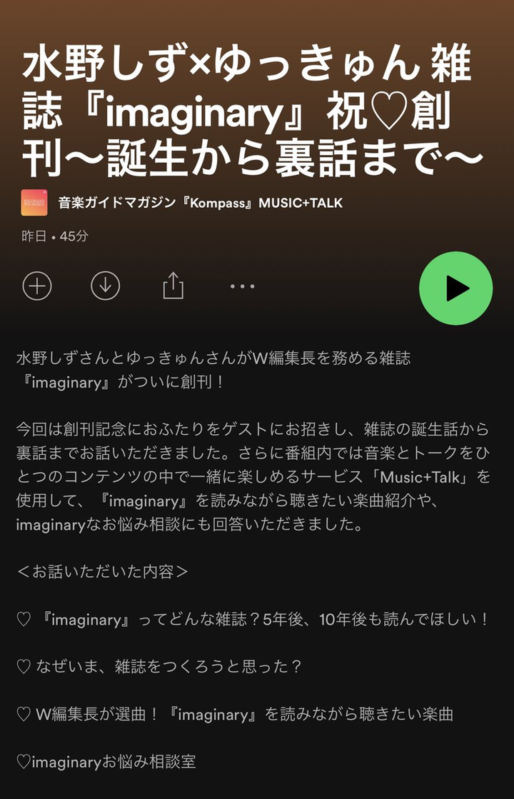 水野しずさんとゆっきゅんさんがW編集長をつとめる雑誌『imaginary』刊行記念のPodcast番組で、構成と台本制作を担当しました。 Podcastやっててよかった…!と思うお仕事でした。