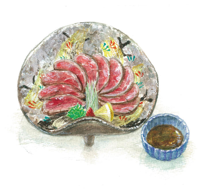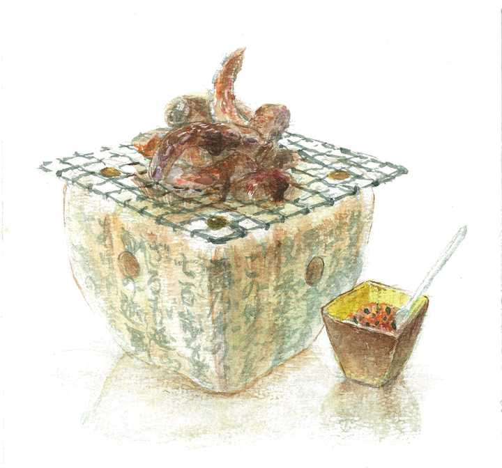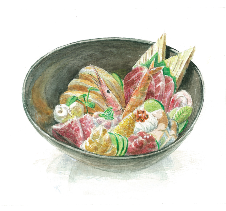 パリで一番古い日本食レストランたからのメニュー、外観の水彩画制作