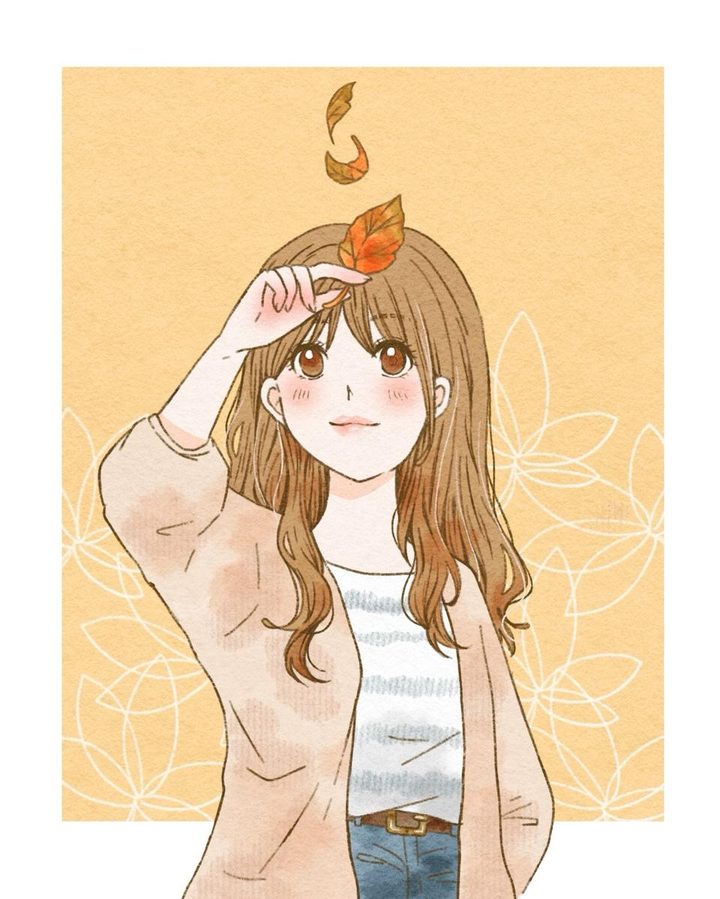 制作環境:Procreate 【 これからな秋に触れて 】 ひらりと落ちてきた葉っぱに手を伸ばす女性。 秋を楽しむ予感を、レトロな雰囲気で描きました。