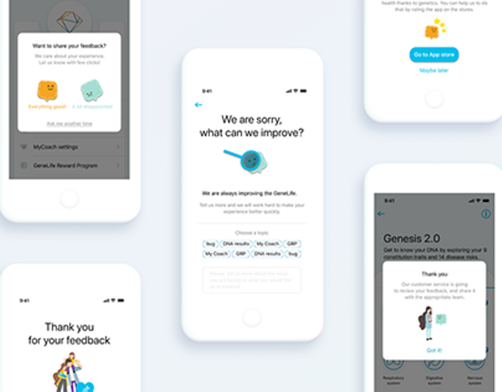 After the launch of the "GeneLife 3.0" app MVP, I started working on different iterations, covering both app improvement, new features, and flow implementations needed to support the business growth. As GeneLife 3.0 is dedicated to the discovery of Genetics testing results and the monitoring of wellness, it's critical to know if our users are meeting any issues at any step of their DNA journey. This use case describes the solution shared by the company to improve the collect of feedback from our users.
