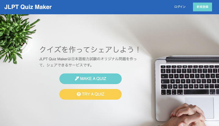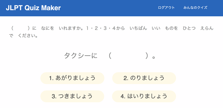 日本語教育能力試験(JLPT)のオリジナル問題を作って、シェアできるサービスです。 制作期間は2週間程度で、使用言語はHTML/CSS/JavaScript/PHPです。