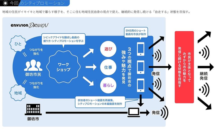 地域住民が同市で暮らすことに喜びや誇りを持ち、各々がより良くしていきたいと感じ、活動していくことができるようになるシビックプライドの醸成や、クリエイティブの手法を使って市外に向けて住民自らが持続的に発信していくことができるような土台づくり、きっかけづくりを、全3回の動画制作ワークショップとして実施。市民が撮影した動画をそれぞれSNSで発信してもらうとともに、市民動画を素材の一部として取り入れた本編動画を作成、同時配信しました。ひと創り起点で地域をエンパワーメントしていくenvisionDRIVENの取り組みの一つです。