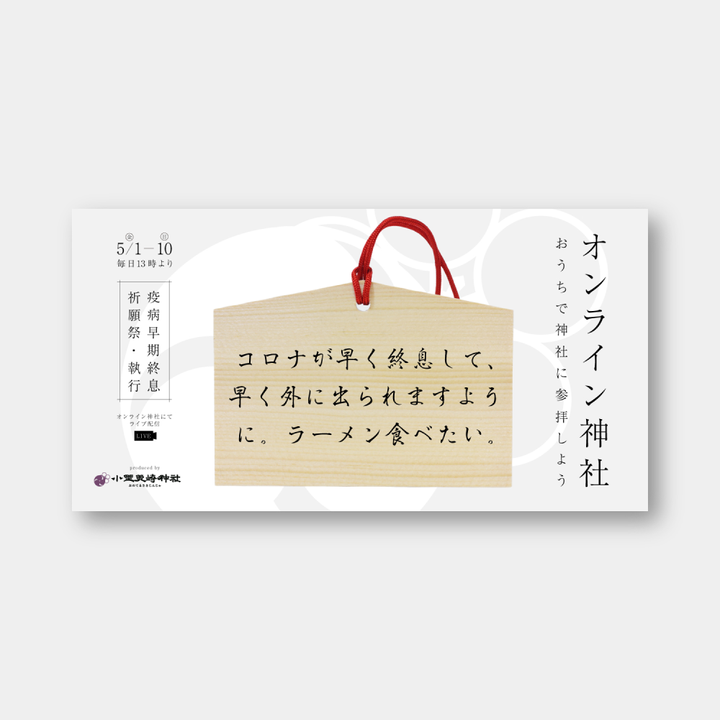 コロナで世の中が大変な中、オンラインで参拝できるLPページ「オンライン神社」のデザインです。 サイト上でお願いを書きこむと、その願い付きが書かれた絵馬でSNSにシェアでき、そのお願い事は小野照先神社で実際に祈祷されました。 国内では「Zip」や「スーパーJチャンネル」、またアメリカの「AP通信」にも取り上げられています。