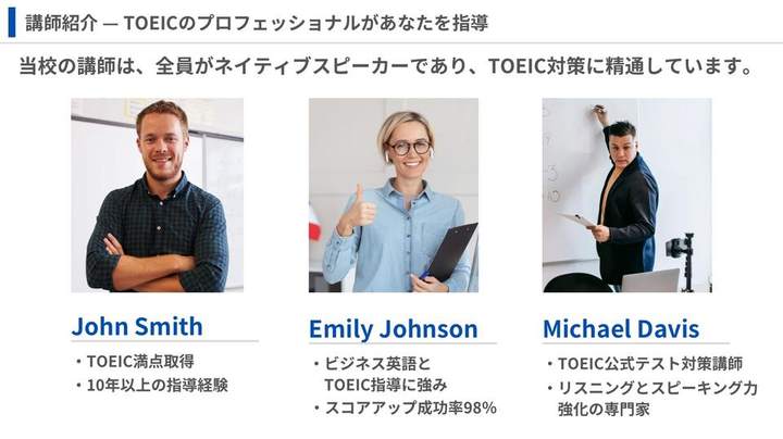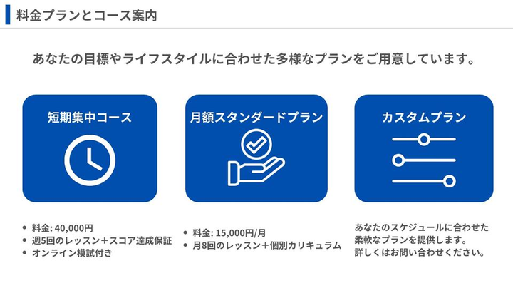 TOEIC対策をしたい社会人・学生向けの英会話オンラインスクールの営業資料を制作しました。 資料のポイント • 料金プラン・サポート内容・他社比較 を図解でわかりやすく説明 • アピールポイントを要点に絞り、シンプルかつ効果的に伝達 • 青と白を基調としたデザイン で統一感を持たせ、信頼感を演出 オンラインで学びたい方やネイティブ講師から学びたい方に向けて、スクールの魅力を分かりやすく伝えることを意識しました。