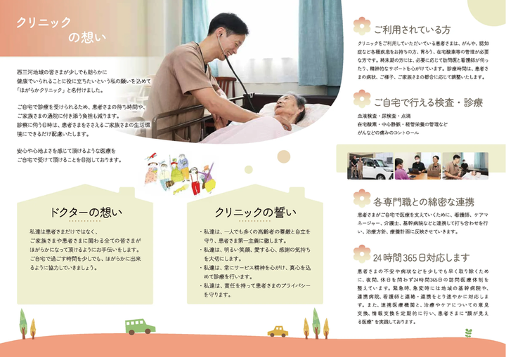 三つ折りパンフレットのリニューアルを担当しました。 ◆作成意図 「ここなら、安心して相談できそう」 そんな風に思っていただけるよう、高齢者の方やご家族の心に寄り添ったデザインを大切にしました。 暖色系のカラーや柔らかいフォント、手書き風のイラストを組み合わせ、医療機関特有の硬さを和らげて温かい雰囲気を演出しています。 実際の診療風景を大きく取り入れることで、利用シーンをイメージできるよう工夫し、クリニックへの信頼感と親近感をつなぐデザインに仕上げました。