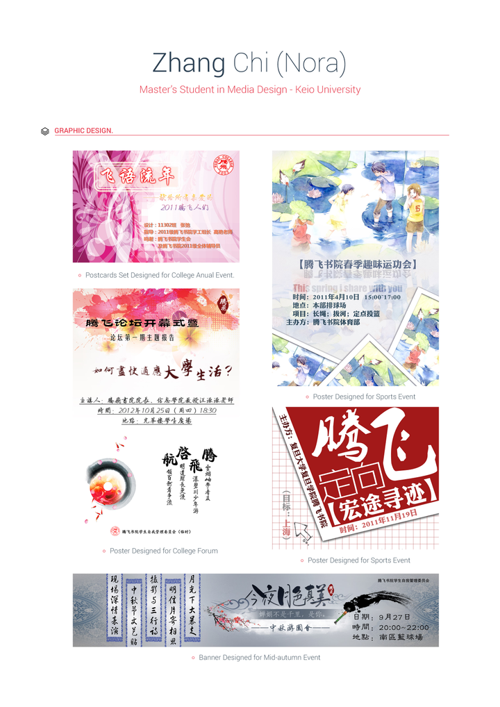 I have designed a large amount of posters, banners, newsletters and yearbooks during my participation as either member or head of Marketing in the student unions and clubs since highschool. Even though I am not a professional in graphic design, I am very familiar with tools like Photoshop, Illustrator and iMovies through these experience.