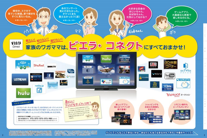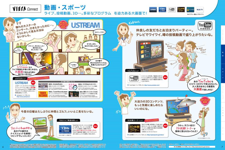 ◆パナソニック株式会社 一家のペルソナを設定し、それぞれの利益に落とし込んだテレビカタログ (SPツール企画) ・ディレクターと企画打合せ ・イラスト方向性を企画し、社内提案 ・イラストラフ制作 ・カタログ グラフィックデザイン(イラスト本番制作) ・社内確認〜修正進行 ・入稿 【企画詳細】 年々複雑化するAV機器を分かりやすいイラストを用いて、日常のシーンで訴求するリーフレットシリーズで、私はデザインの方向性と、マンガで見せるシーン・カットイラストの提案を担当しました。