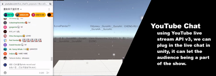 I'm the leader and engineer in this project. This is the final project in our class , to make a product on Unity , we all like to watch Vtuber's live show on YouTube , so we make this project to make it even better.